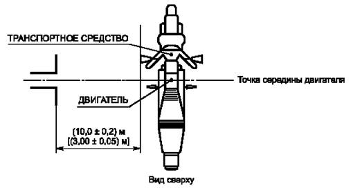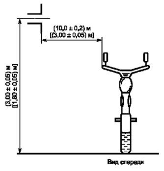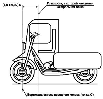 на расстоянии (1,0 ± 0,2) м за вертикальной осевой линией переднего колеса транспортного средства (точка С, указанная в дополнении 3 к настоящему приложению) для трехколесных транспортных средств,