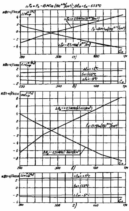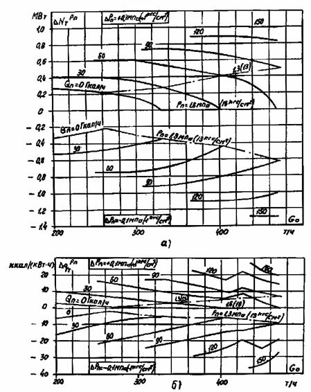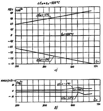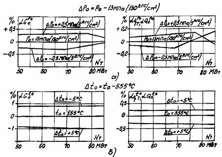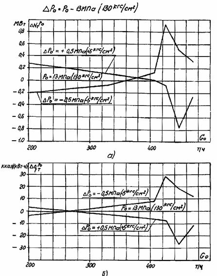 а - на отклонение давления свежего пара от номинального на ±0,5 МПа (5 кгс/см2); б - на отклонение температуры свежего пара от номинальной на ±5 °С