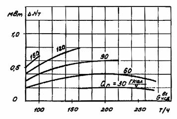 Рис. 7. Поправка к мощности турбины на переброску возврата конденсата производственного отбора за ПНД № 2 при режимах с регулируемыми отборами (условие: возврат конденсата 100 % при температуре 100 °С)