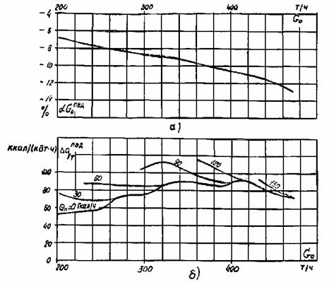 а - к расходу свежего пара; б - к удельному расходу теплоты