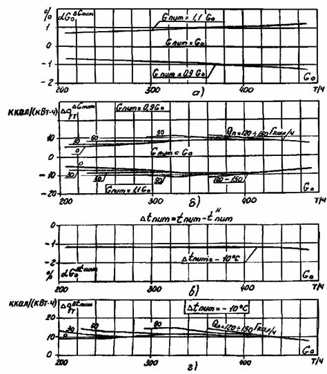 а, б - соответственно к расходу свежего пара и удельному расходу теплоты на отличие расхода питательной воды от расхода свежего пара; в, г - соответственно к расходу свежего пара и удельному расходу теплоты на подогрев питательной воды на 10 °С