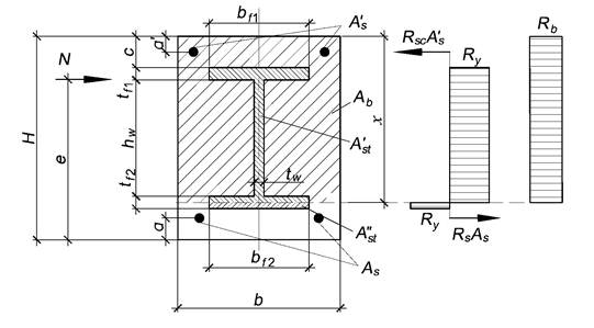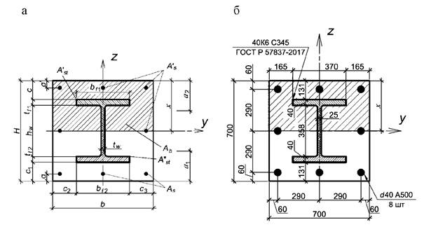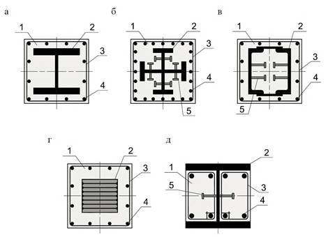 Сталежелезобетонные конструкции - оптимальный вид конструкций при проектировании и возведении многоэтажных, высотных зданий, конструкций зрелищных сооружений и сооружений, где требуется повышенная прочность конструкций, малые габариты в плане для колонн, а также высокая огнестойкость [1], [2]. Наибольшей технологичностью изготовления и монтажа отличаются поперечные сечения, без замкнутых полостей (рисунок 4.1 а, б, г, д).