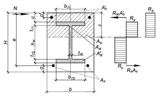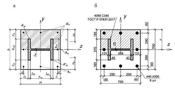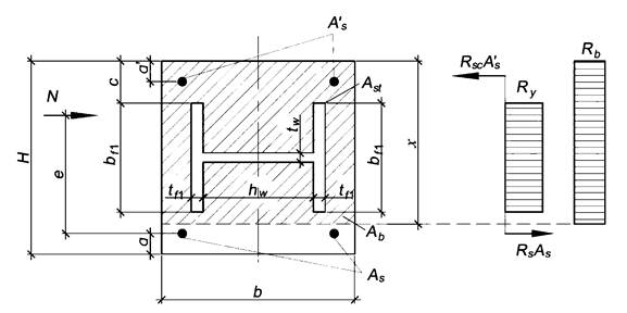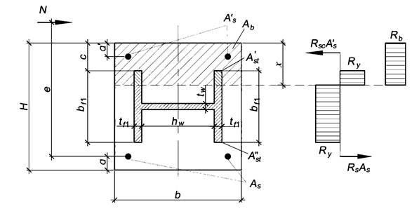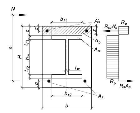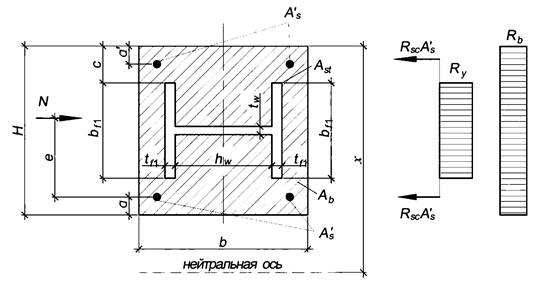 Определяем высоту сжатой зоны сечения, предполагая, что часть сердечника сжата, часть растянута на основании СП 266.1325800.2016 (подпункт 7.1.2.2):