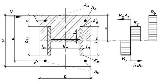 5.3 Наиболее точные результаты дает расчет с применением диаграмм деформирования бетона, стального сердечника и стержневой арматуры. При выполнении расчета в стали жесткой и в стали стержневой арматуры допускаются пластические деформации, не превышающие предельные значения, приведенные в СП 16.13330, СП 63.13330 и СП 266.1325800. Работа растянутого бетона, как правило, не учитывается. Работу растянутого бетона допускается учитывать при использовании фибробетонов. При учете работы растянутого бетона формулы, приведенные в 5.7, следует корректировать, вводя дополнительное слагаемое RbtAb, где Rbt - прочность бетона на растяжение, Abt - площадь сечения растянутого бетона.