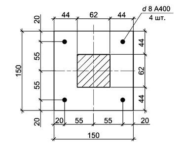 Дано: сталежелезобетонная колонна среднего этажа рамного каркаса квадратного поперечного сечения с размерами по рисунку А.4. Длина колонны - 0,6 м, шарнирное опирание на двух концах. Бетон класса по прочности на сжатие В80. Жесткая арматура - стальной сердечник квадратного сечения 62×62 мм из стали С255. Стержневая арматура - 4 шт. d8А400. Строительство в г. Москве.