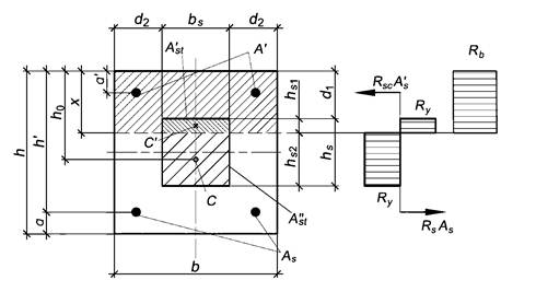 My.ult = Rbbd1(h0 - d1/2) + Rb(b - bs)(x - d1)(h0 - (x + d1)/2) + RscA's(h0 - d1) + Rybs(x - d1)hs/2) =