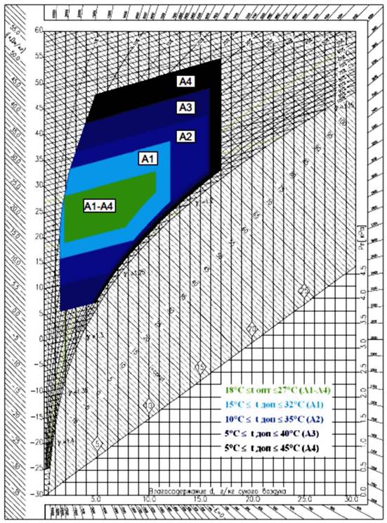 5.1.1 Оптимальные и допустимые параметры воздуха на входе в серверное оборудование рекомендуется принимать по таблице 5.1 с учетом I-d диаграммы, приведенной на рисунке 5.1.