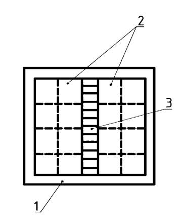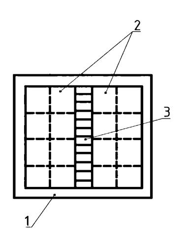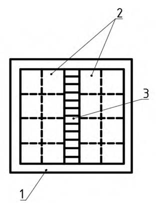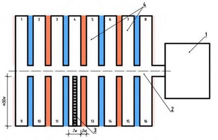 К административному зданию 1 примыкает технологическая галерея 2, от которой в обе стороны отходят серверные залы 4 с рядами серверных стоек 3. Рассмотренный вариант содержит 16 серверных залов длиной около 50 м. Общее число стоек составляет около 700 единиц. Потребляемая серверами одного этажа мощность может составлять 3500 - 7000 кВт.