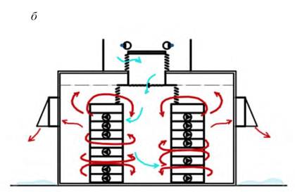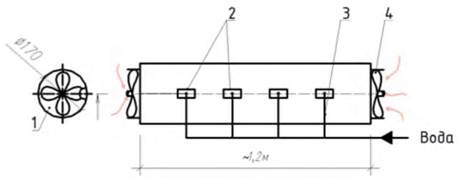 7.5.5 Для снижения температуры конденсации холодильного агента и снижения потребляемой мощности компрессоров ПКХМ порядка 17 % целесообразно применять испарительное охлаждение воздуха, идущего на конденсатор. На рисунке 7.16 показана схема аппарата воздушного охлаждения, в зону всасывающего факела которого подаются мелкодисперсные капли воды, а интенсификатор массообмена повышает интенсивность турбулентности с естественно природного уровня от ε = 3 % до ε = 50 % - 65 %.