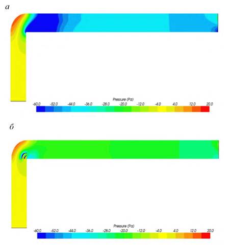 При использовании направляющих лопаток с указанными характеристиками уменьшается зона отрыва, а аэродинамическое сопротивление (коэффициент местного сопротивления) снижается в 2,3 раза.