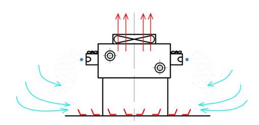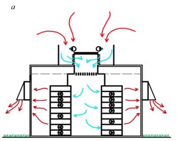 Осевые вентиляторы интенсификатора перемещают воздух с расходом около 10 % - 15 % расхода через конденсатор.