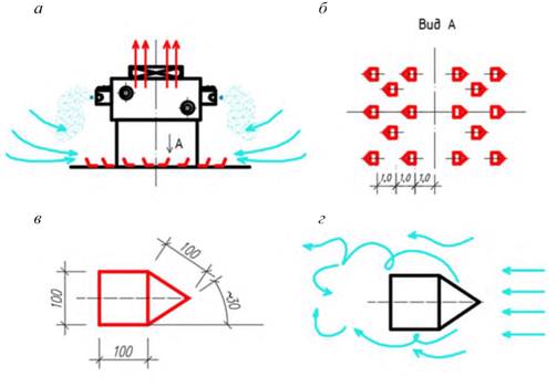 7.5.6 Для испарения капель спрея воды, попадающих на площадку под конденсаторами под действием порывов ветра, на площадке следует в шахматном порядке выкладывать Δ-крылья, которые забирают часть энергии потока воздуха и, создавая за собой два интенсивных вихря, интенсифицируют испарение упавшей на плоскость воды (рисунок 7.17).