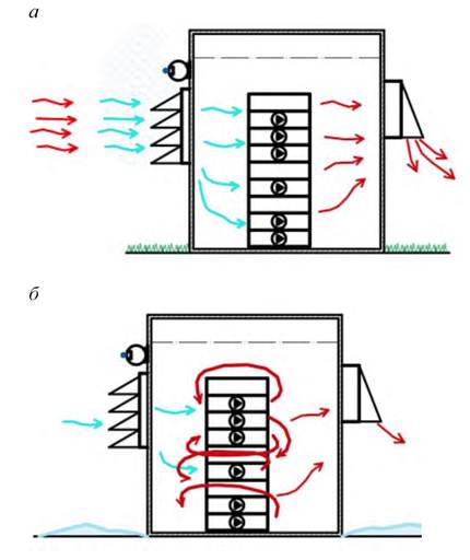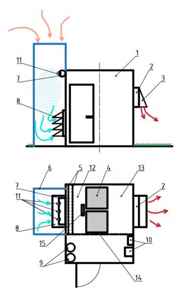 В жаркое время теплого периода года наружный воздух через выгородку из листового поликарбоната 6 поступает в воздухозаборное устройство 8. На пути воздуха установлен интенсификатор массообмена 7, с осевыми вентиляторами и распылителями воды 11. Воздух, охлажденный до температуры t = 27 °С, входит в корпус ЦОД и, проходя через фильтры грубой и тонкой очистки 5, поступает в холодный коридор 12. Серверное оборудование собственными вентиляторами 15 забирает воздух из холодного коридора и, охлаждая тепловыделяющие элементы, подает его в горячий коридор 13. Из горячего коридора воздух температурой 40 °С - 45 °С забирают вентиляторы 2 и через защитный козырек 3 выбрасывают в окружающую среду.