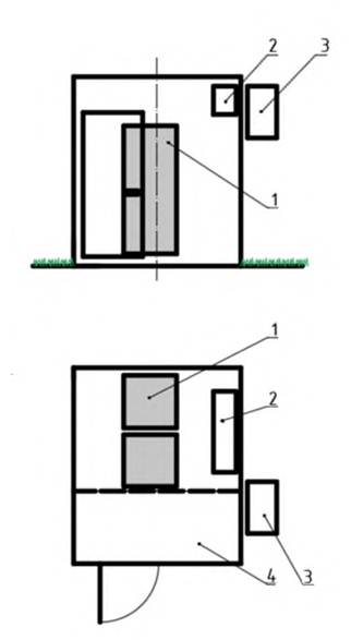 В корпусе 4, в технической зоне, размещены две и более серверных стоек 1 с оборудованием. В зоне горячего коридора размещен воздухоохладитель непосредственного испарения 2 с собственным осевым вентилятором. На воздухоохладитель работает компрессорно-конденсаторный агрегат 3, размещенный на стене контейнера.