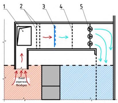 В этом случае СТКВ реализуется как замкнутая, без связи с наружным воздухом. Воздухоохладитель забирает воздух из горячего коридора и подает его в холодный коридор.