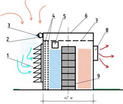 8.5 При создании разомкнутой энергоэффективной СТКВ обустраивают шахту наружного воздуха 6, а в центре горячего коридора устраивают вытяжную шахту с осевыми вентиляторами. Вокруг оголовка воздухозаборной шахты устраивают систему испарительного охлаждения (рисунок 8.4).