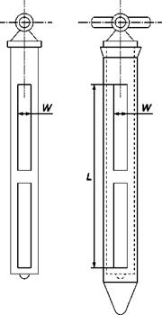 Пробоотборная трубка состоит из двух металлических труб, вставляемых одна в другую. Трубки на протяжении рабочей длины (L) имеют не менее двух отверстий прямоугольной формы. Рабочая длина L должна составлять не менее 600 мм. Ширина прямоугольных отверстий (W) должна быть не менее 24 мм. Толщина стенок труб не должна допускать их деформаций в процессе отбора проб минерального порошка. Пробу отбирают при погружении пробоотборной трубки в материал путем кручения внутренней трубы вокруг продольной оси.