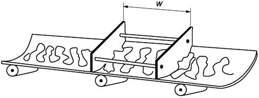 4.6 Пробоотборная рама для отбора проб с неподвижной конвейерной ленты (рисунок 2). Длина разделительных листов пробоотборной рамы должна быть не менее ширины конвейерной ленты. Профиль боковых элементов должен обеспечивать их плотное прилегание к поверхности транспортной ленты. Высота разделительных листов должна быть достаточной, чтобы исключить высыпание зерен щебня. Расстояние между разделительными листами, w, должно составлять не менее ширины расположения материала на ленте, при этом масса отбираемой пробы должна удовлетворять требованиям таблицы 1.