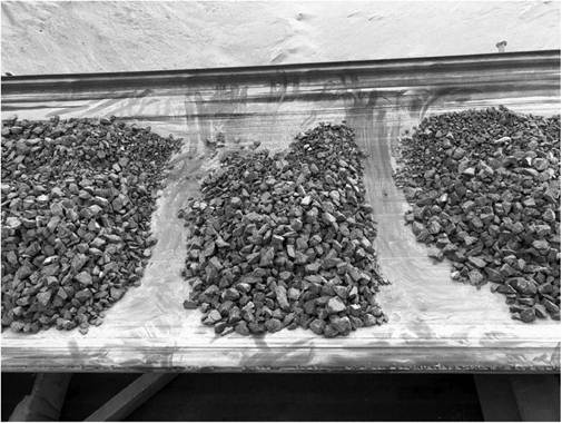 в центре и четыре по углам. Предварительно поверхность в точке отбора щебня разравнивают. Расстояние от угловых точек отбора до стенок вагона должно быть от 0,3 до 0,6 м. Отбор проводят при помощи совка или лопаты. Отбор проб необходимо проводить из лунок глубиной не менее 20 см.