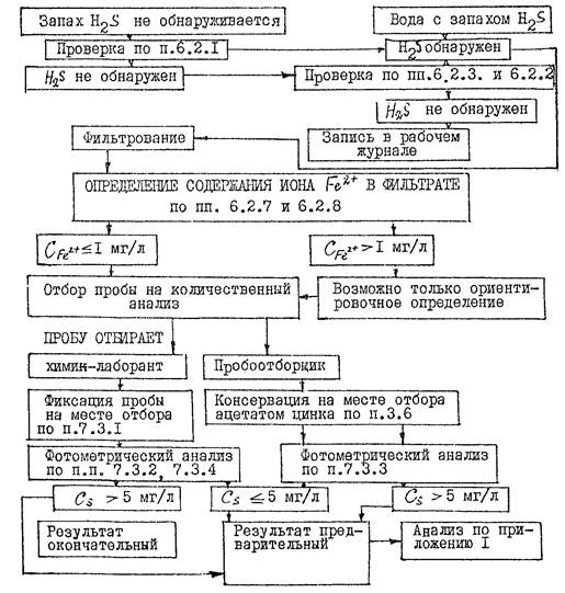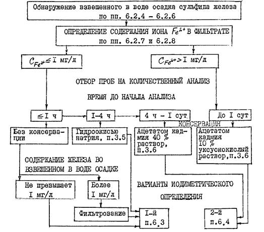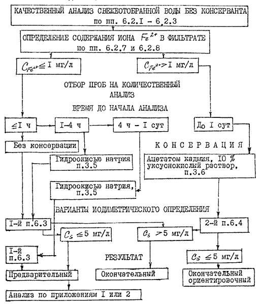 1.1.1. Определению иодиметрическим методом мешает присутствие в воде органических и неорганических веществ, реагирующих с йодом. Наиболее типичным мешающим компонентом являются соединения закисного железа. Мешающее действие остальных компонентов обычно проявляется при сравнительно малых концентрациях сероводорода (менее 50 мг/л) и может учитываться при анализе проведением «холостого» титрования в сочетании с консервацией уксуснокислым раствором ацетата кадмия.