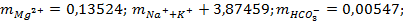 2.1. По формуле (9), п. 8.2.2 рассчитывается общее содержание растворенных в воде солей, г/л. При этом массы ионов, соответствующих шестикомпонентному анализу, последовательно выбираются из следующего числового ряда: 40,08; 24,312; 23; 61,017; 35,453; 96,062.