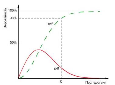В pdf отображается вероятность различных значений последствий в визуальной форме, включая наиболее вероятное значение, дисперсию и вероятность возникновения экстремального события.