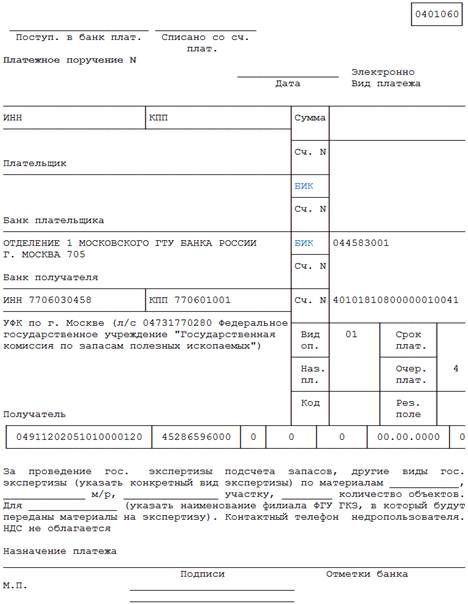 назначение платежа: За проведение гос. экспертизы подсчета запасов и другие виды экспертизы, проводимые ФГУ "ГКЗ" и его филиалами (указывается конкретный вид оплачиваемой экспертизы) по материалам ___________, ___________, месторождения, ____________ участка, ______________ количество объектов. Указывается наименование филиала ФГУ "ГКЗ", в который будут переданы материалы на экспертизу (если материалы передаются в ФГУ "ГКЗ", указывается ФГУ "ГКЗ"). Контактный телефон недропользователя. НДС не облагается.