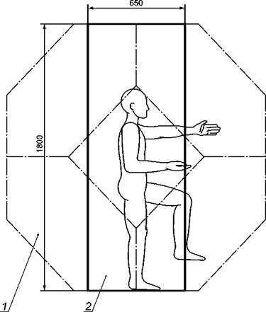 На высоте более 600 мм над уровнем площадки угол, образованный между сходящимися элементами, с нижним краем, расположенным над горизонталью, должен составлять более 55°. [Угол между сходящимися частями, нижняя кромка которых расположена выше горизонтали, должен составлять более 55° на расстоянии более 600 мм от покрытия (земли)].
