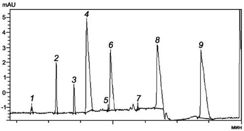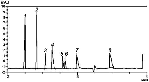 нитрат-ионы; 5 - фторид-ионы; Рисунок Е.1 - Электрофореграмма градуировочного раствора (схема испытаний № 1) |