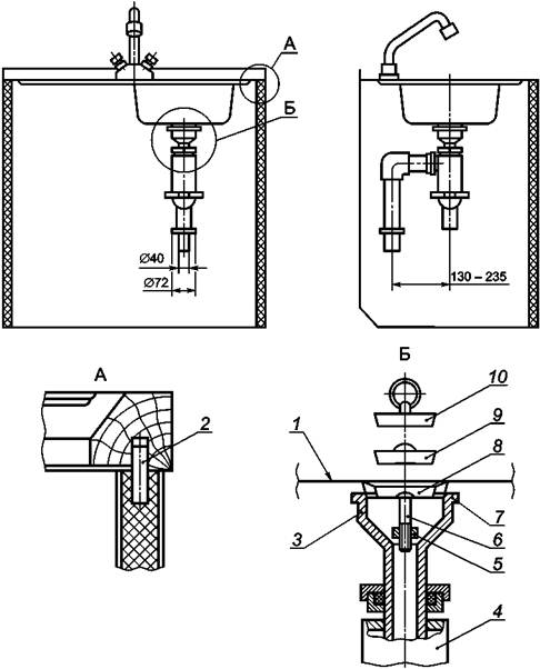 - нагель; 3 - выпуск; 4 - сифон; 5 - гайка; 6 -