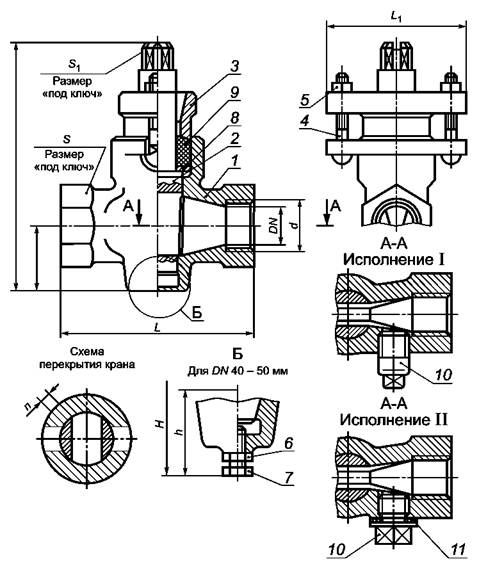 В корпусе кранов DN 15 мм и DN 20 мм в пределах допусков на соответствующие размеры допускается пересечение резьб муфтового конца и спускного отверстия.