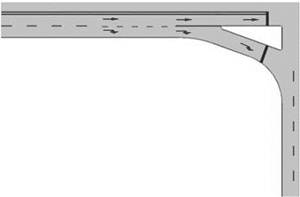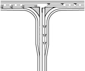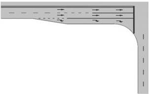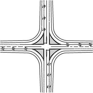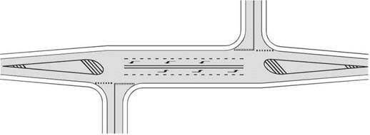 3.4 канализированное пересечение: Пересечение или примыкание в одном уровне с выделенными с помощью разделительных островков полосами для различных направлений движения транспортных потоков.