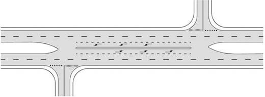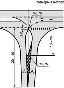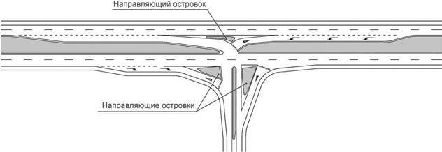3.17 частично канализированное пересечение: Пересечение или примыкание в одном уровне с выделенными с помощью разделительных островков полосами для части из осуществляемых направлений движения транспортных потоков.