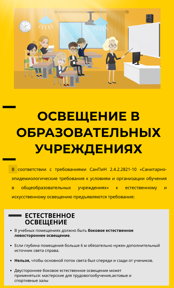 В соответствии с требованиями СанПиН 2.4.2.2821-10 "Санитарно-эпидемиологические требования к условиям и организации обучения в общеобразовательных учреждениях к естественному и искусственному освещению" предъявляются следующие требования: