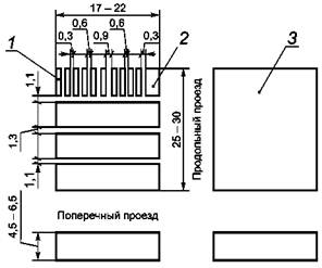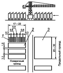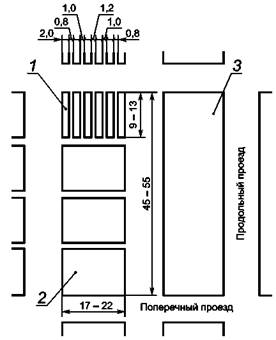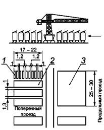 1 - штабель; 2 - двойной штабель; 3 - группа Рисунок А.11 - Планировка групп штабелей при укладывании заготовок на открытой площадке |