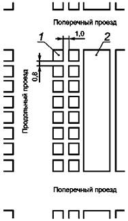 1 - штабель; 2 - группа Рисунок А.10 - Планировка групп штабелей при укладывании заготовок под навесами |