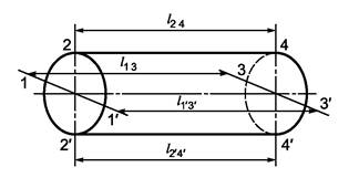 Проверку длины мерных слитков, предназначенных для кабельной и электротехнической промышленности, проводят штангенциркулем по ГОСТ 166 в четырех местах по длине образующих линий (l13, l1'3',l24, l2'4'), лежащих на пересечении с поверхностью слитка, двух взаимно перпендикулярных плоскостей 1-1'-3'-3 и 2-2'-4'-4 (рисунок 1). Цилиндрический слиток мерной длины перед проведением измерения укладывают на ровную горизонтальную поверхность (плита класса 2 размером 400×630 по ГОСТ 10905). Губки штангенциркуля плотно прижимают к торцевым плоскостям слитка на расстоянии 10 - 15 мм от образующей линии.