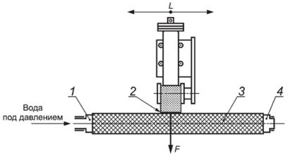 1, 4 - штуцер; 2 - шкурка; 3 - рукав; L - ход шкурки; F - усилие прижатия шкурки Рисунок 3 - Схема истирания образца рукава |