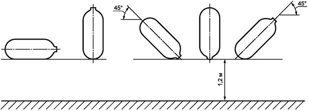 7.14.4 Каждый баллон должен быть сброшен с высоты (1,2 ± 0,1) м на плоскую поверхность плиты из каждого из пяти положений, как показано на рисунке 5.