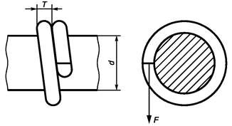 Свободный конец образца нагружается с силой F = 45 Н. Через 5 мин измеряют внешний диаметр рукава, при этом рукав должен быть обернут вокруг цилиндра. Определяют максимальный наружный диаметр Т. Коэффициент рассчитывается к так T/D. Коэффициент T/D при температуре окружающего воздуха (23 ± 2) °C не должен превышать 1,20, и не должно быть видимых признаков перегиба по всей длине образца рукава.
