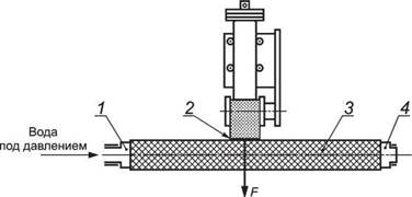 1,4 - штуцер; 2 - шкурка; 3 - рукав; L - ход шкурки; F - усилие прижатия шкурки |