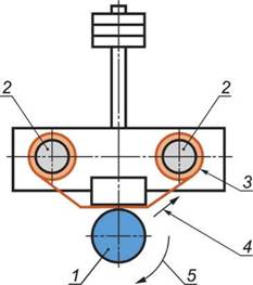 1 - рукав; 2 - ролики лентопротяжного механизма со шкуркой; 3 - шкурка; 4 - направление подачи шкурки; 5 - направление вращения образца рукава |