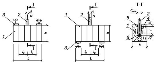 5.1.2 Определение нормативных значений сопротивлений  и  клееной древесины или многослойной клееной древесины из шпона выдергиванию или продавливанию вклеенного стержня, а также его податливости ,  определяют путем испытаний образцов натурных размеров, состоящих из деревянных элементов и вклеенных стержней, изготовленных из арматурной стали или композитной арматуры (рисунок 1).