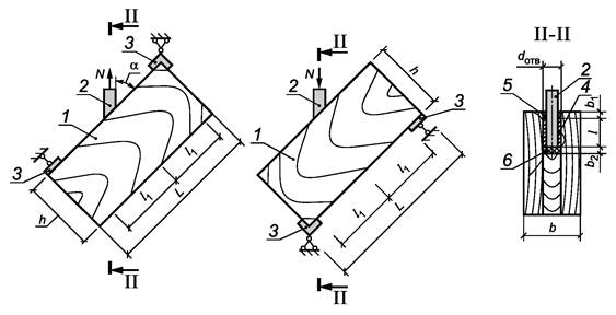 5.1.3 Нормативные значения сопротивлений  и  определяют в зависимости от диаметра d вклеенного стержня, его материала, материала деревянного элемента и угла α наклона продольной оси вклеенного стержня к волокнам древесины. Количество опытных образцов принимается в соответствии с требованиями, установленными в ГОСТ Р 58459.