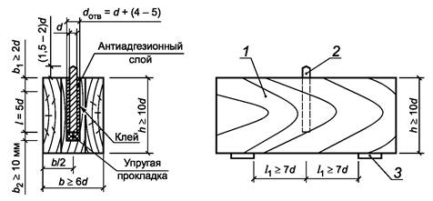 5.2.10 В элементах из клееной древесины на расстоянии менее 3dотв вдоль волокон и менее 2dотв поперек волокон от оси отверстия под вклеенный стержень не допускается наличия сучков, трещин и других пороков древесины.