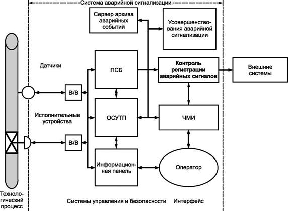 Основная функция системы аварийной сигнализации - уведомить операторов об отклонениях от нормы технологических параметров или о сбоях оборудования и содействовать ответному действию. Системы аварийной сигнализации могут быть включены как в основную систему управления технологическим процессом (ОСУТП), так и в приборную систему безопасности (ПСБ), каждая из которых выполняет измерения технологических параметров и логические операции для формирования аварийных сигналов. Рисунок 1 иллюстрирует концепцию аварийной сигнализации и связанного с ответным действием потока информации в системе аварийной сигнализации. Система аварийной сигнализации также включает механизм для передачи оператору информации об аварийном сигнале через ЧМИ, как правило, на монитор или панель индикации. Дополнительными функциями системы аварийной сигнализации являются ведение журнала регистрации аварийных сигналов и событий, поддержка сервера архива аварийных событий и генерация метрик производительности для конкретной системы аварийной сигнализации. Существуют внешние системы, которые могут использовать данные из системы аварийной сигнализации.