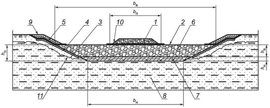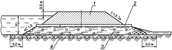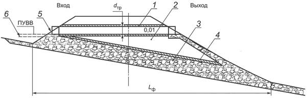 4.6 В зависимости от местных условий (топографических, гидравлических, мерзлотных и геологических) применяют различные типы водопропускных сооружений и систем водоотведения. К ним относятся трубы, дамбы, лотки, канавы и фильтрующие насыпи. На автомобильных дорогах низших категорий допускается перелив воды через полотно дороги по специальным лоткам, являющимся одновременно и проезжей частью дороги, а также по устройствам, отводящим воду с проезжей части дороги и разделительных полос.