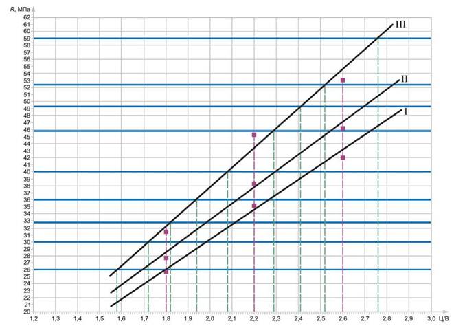 R - прочность бетона, МПа; I - в возрасте 3 сут; II - в возрасте 7 сут; III - в возрасте 28 сут