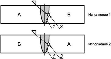 исполнение 1 - зарубка расположена по зоне сплавления материала сварного шва и основного материала Б;
