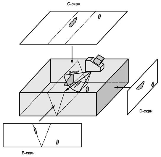 6.5.4 Для анализа полученных данных используют ПО, поставляемое совместно с используемым дефектоскопом либо иным специализированным ПО, позволяющим анализировать A-, B-, C-, D-, S- или E-сканы (рисунок 5) для всех схем прозвучивания.
